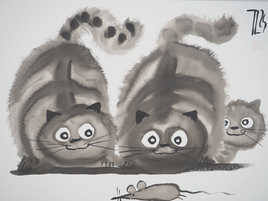 Laszlo TIBAY : Couple de chats en chasse et leur chaton - Dessin original signé