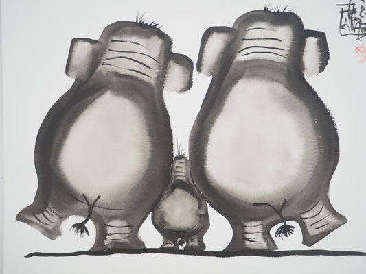 Laszlo TIBAY : Famille d'éléphants - Dessin original signé