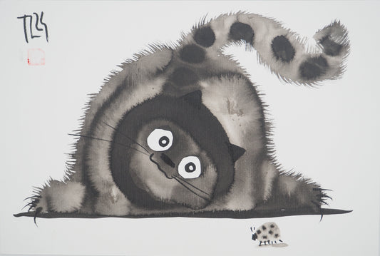 Laszlo TIBAY : Chat observant une coccinelle - Dessin original signé