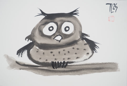 Laszlo TIBAY : L'hibou perché sur sa branche - Dessin original signé