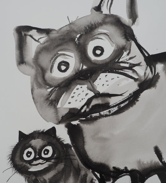 Laszlo TIBAY : Chien et son ami le chat - Dessin original signé