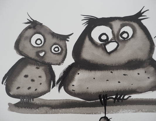 Laszlo TIBAY : Famille de hiboux - Dessin original signé