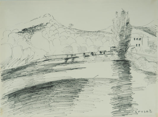 Roger CRUSAT : Village au bord du fleuve - Dessin original signé
