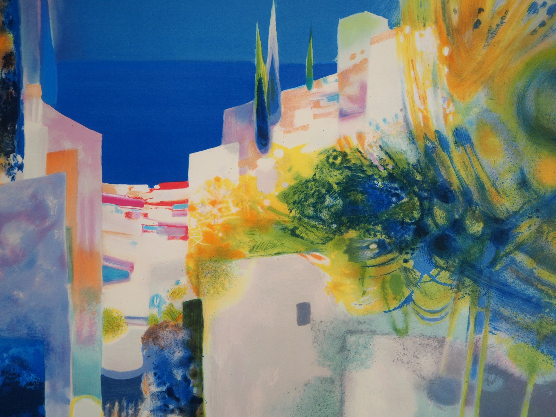 Daniel GELIS : Village en bord de mer - Lithographie originale signée