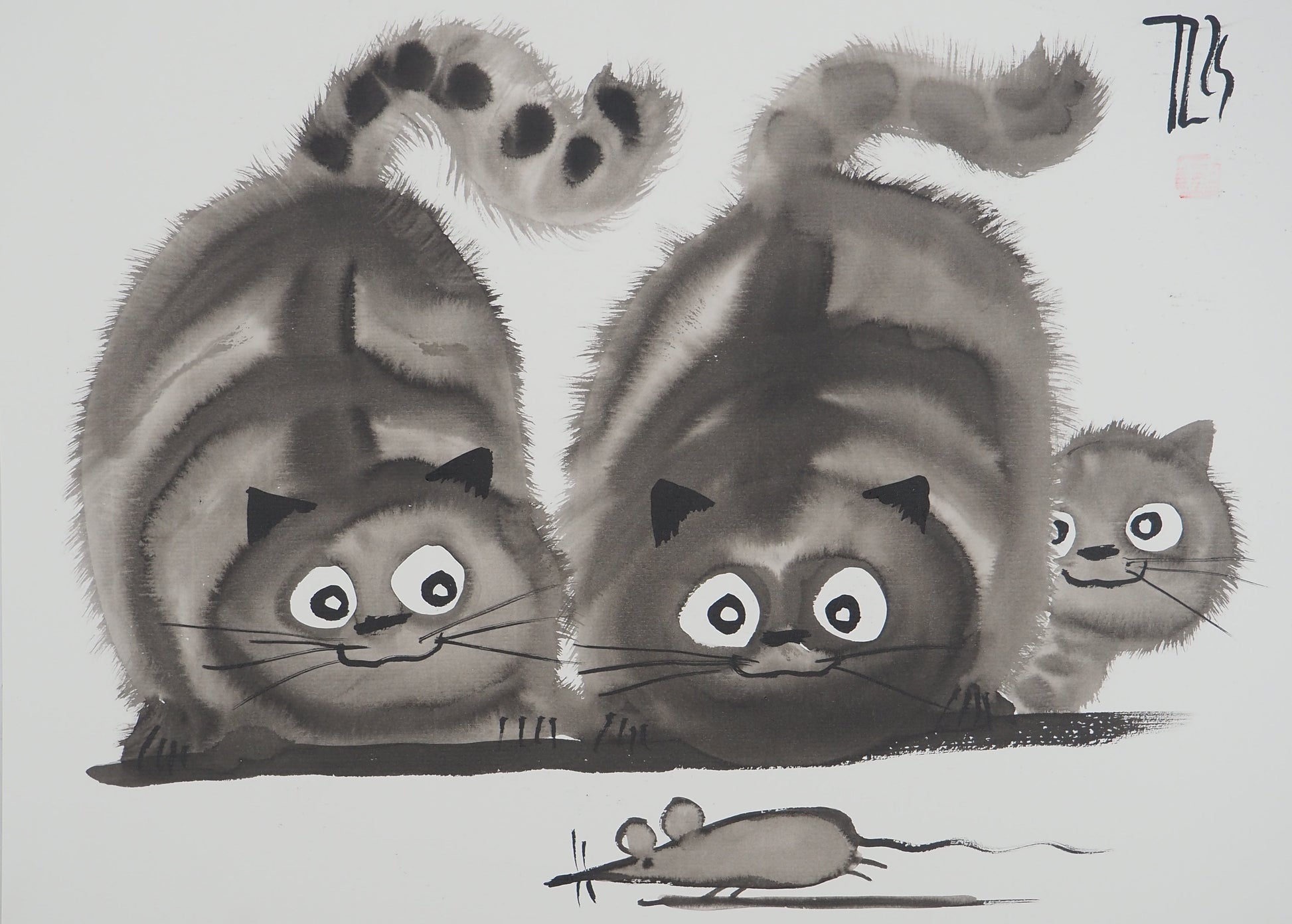 Laszlo TIBAY : Couple de chats en chasse et leur chaton - Dessin original signé